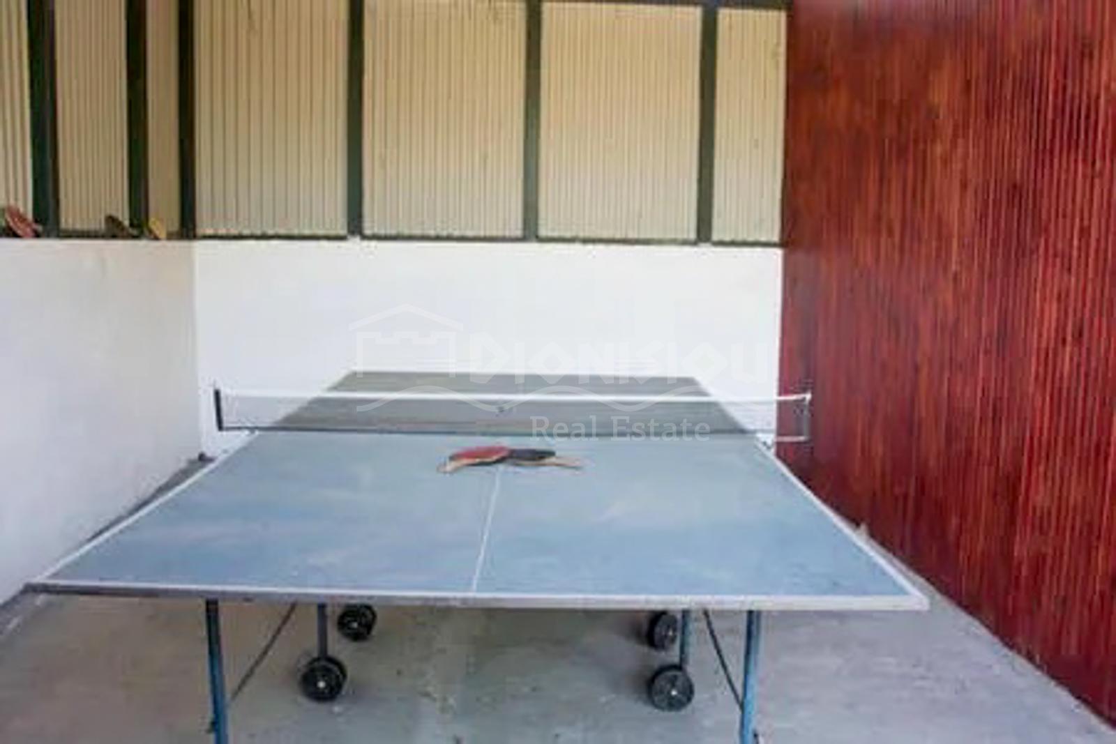 There is a 1000 sq. meters garden with a football pitch, BBQ, 2 storage rooms and a covered area with a ping-pong table.