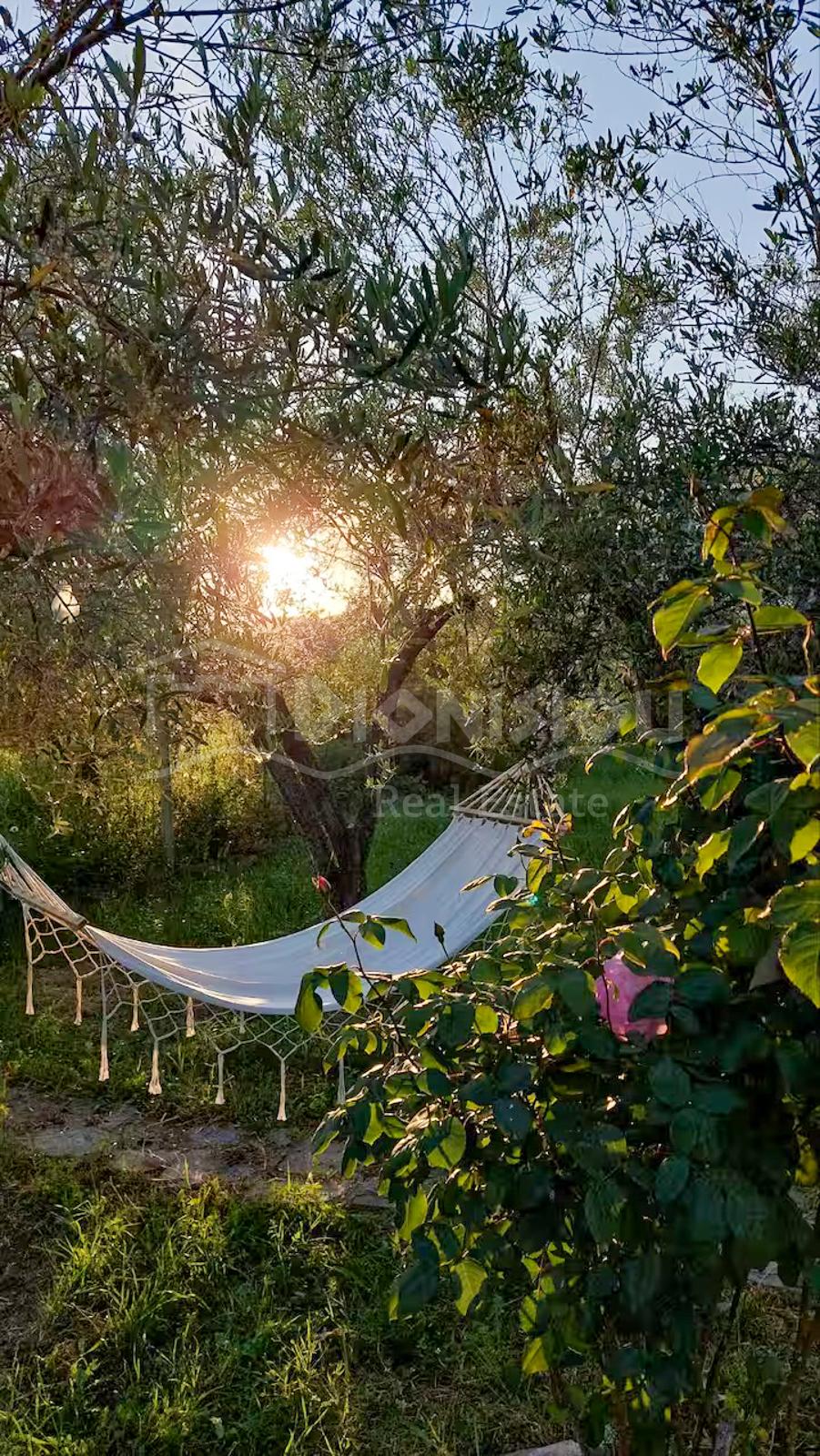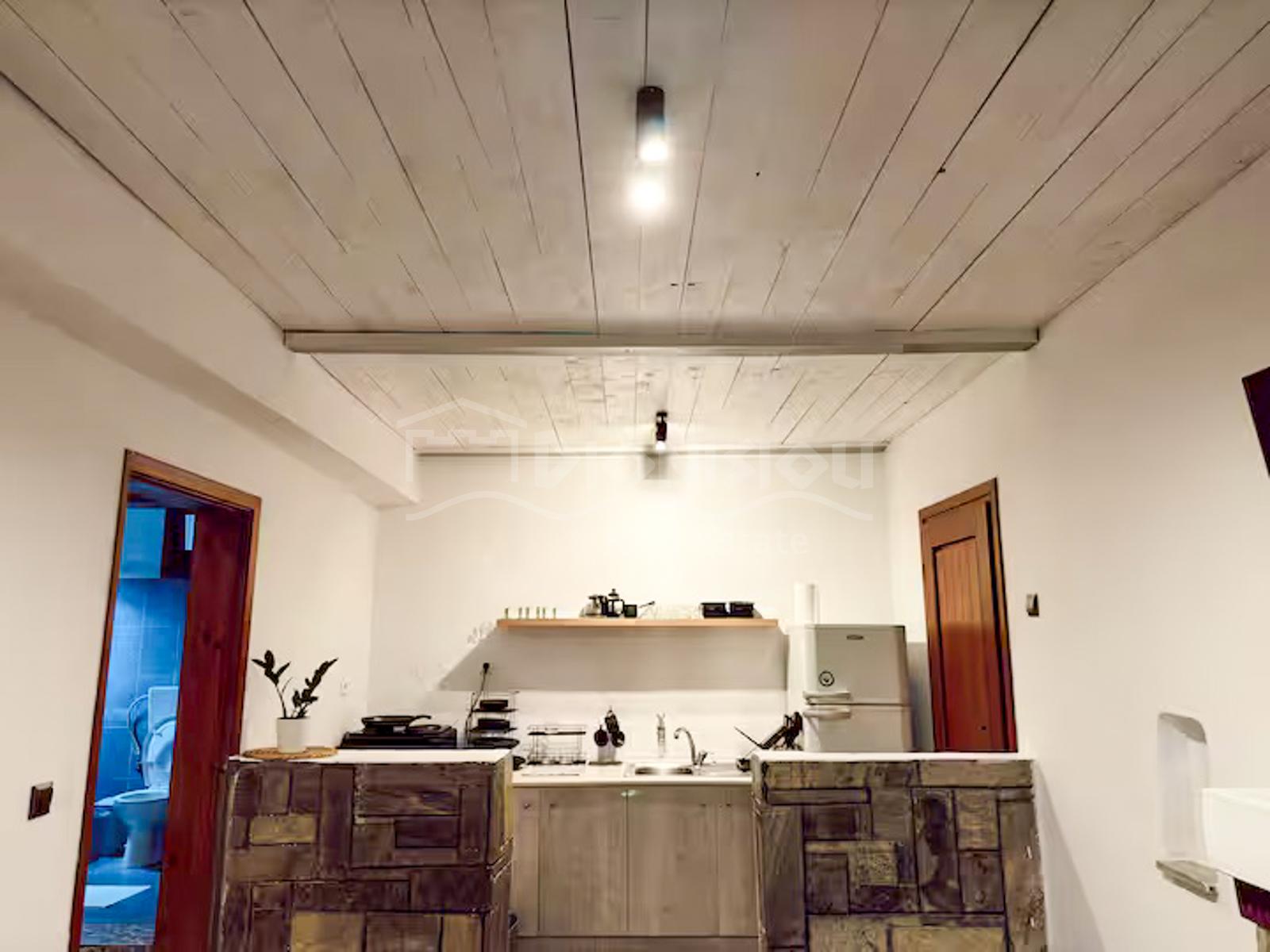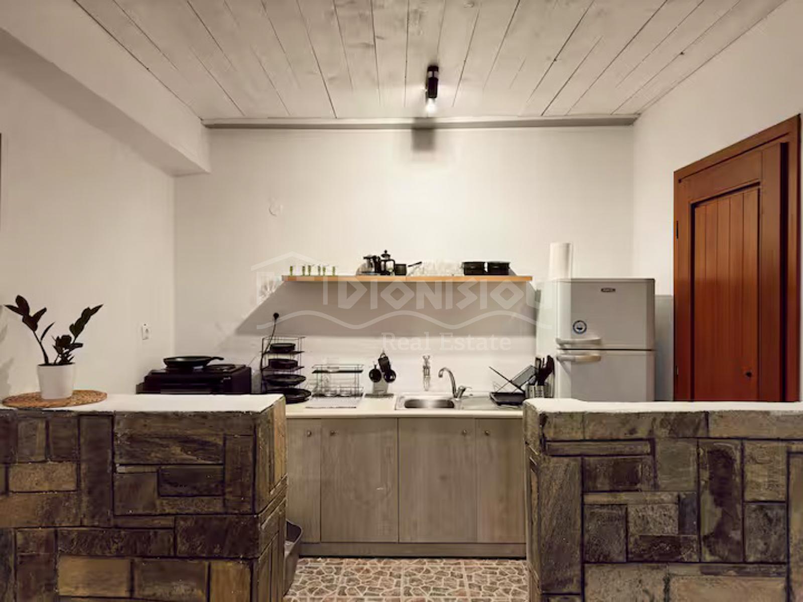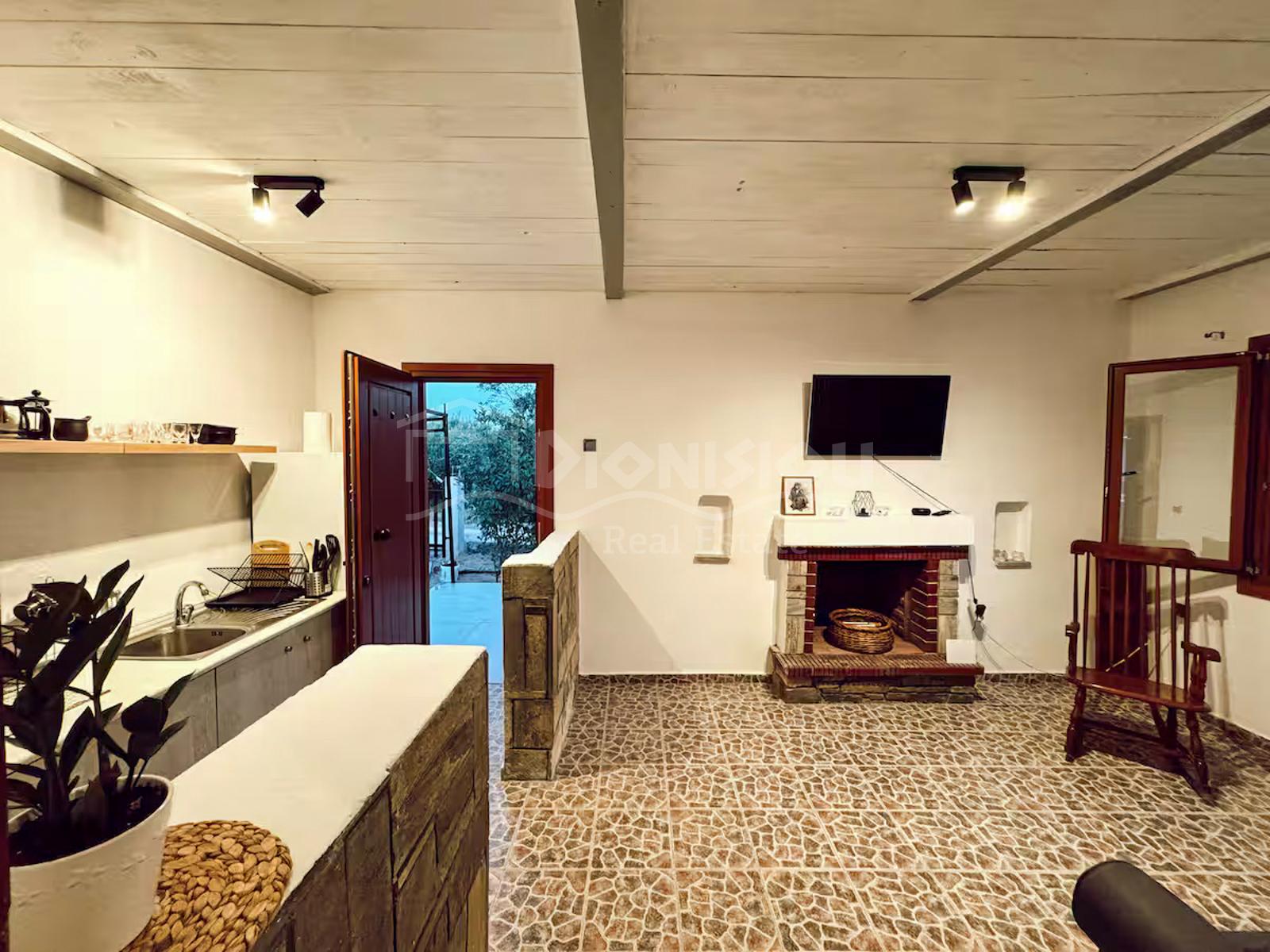 The house is located on the high ground floor and consists of a living room with a fireplace and a kitchen, a bedroom, a bathroom and a veranda.