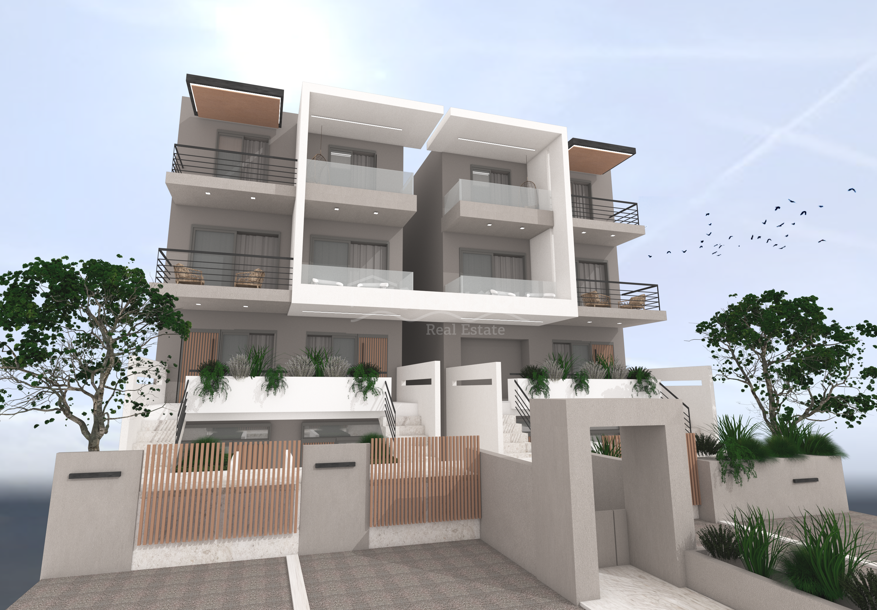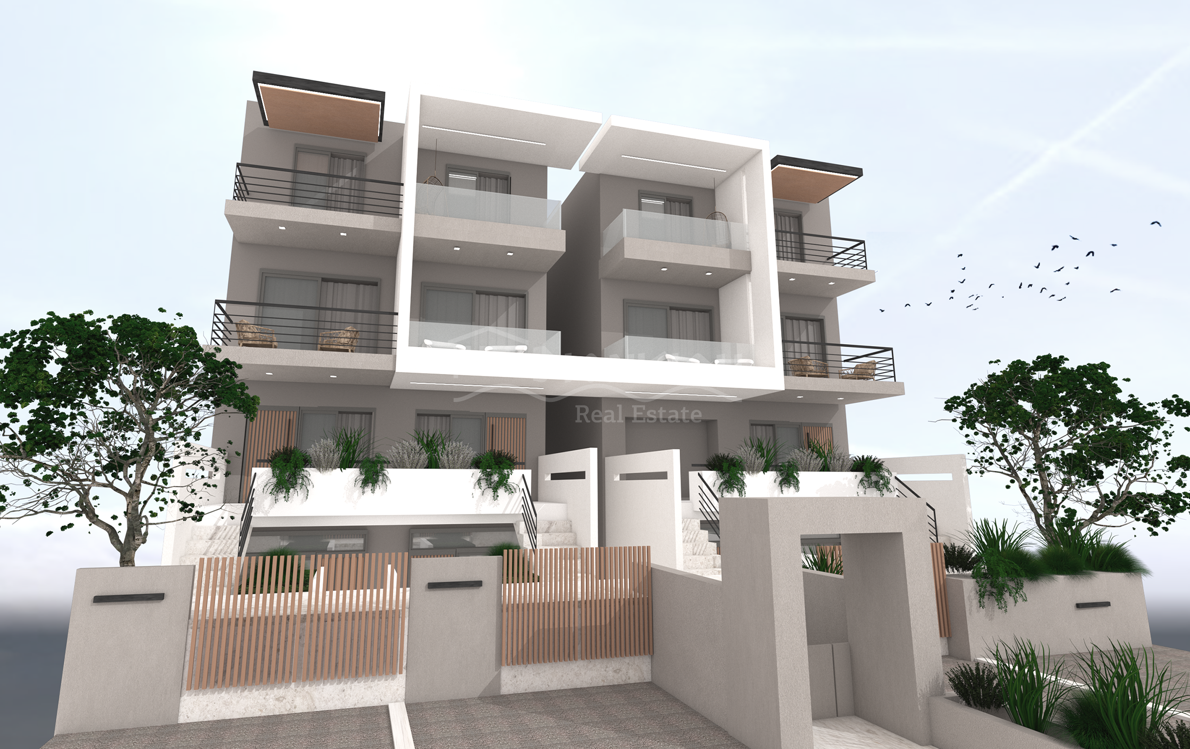 The apartment is equipped with 3 air-conditions, installation of individual heating system (heating floors with waterpump), a kitchen (choice from the customer), internal doors, external sliding aluminium doors, security entrance door, glass cover for shower, 160 litre solar heating system, pre-installation for alarm system, pre-installation for satellite TV, pre-installation for electric sunshade tents.