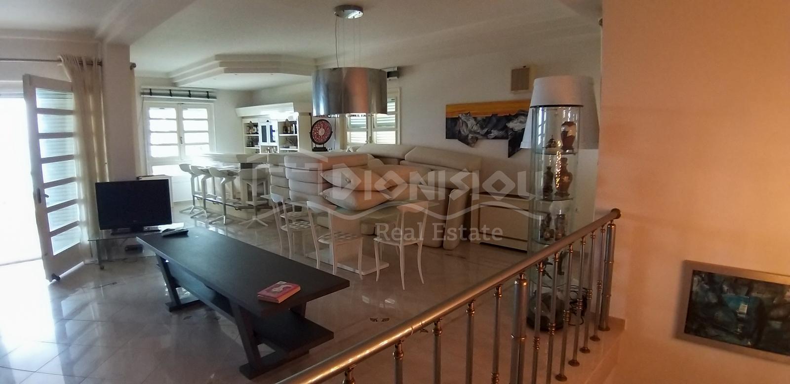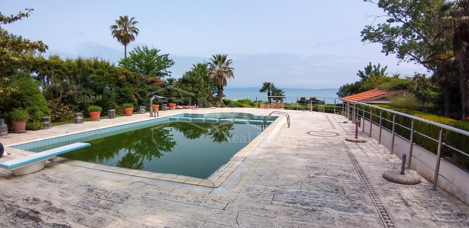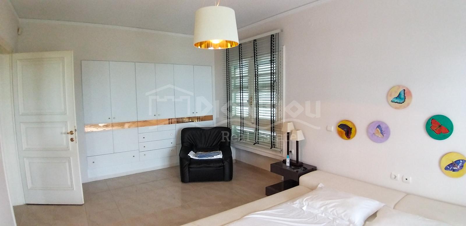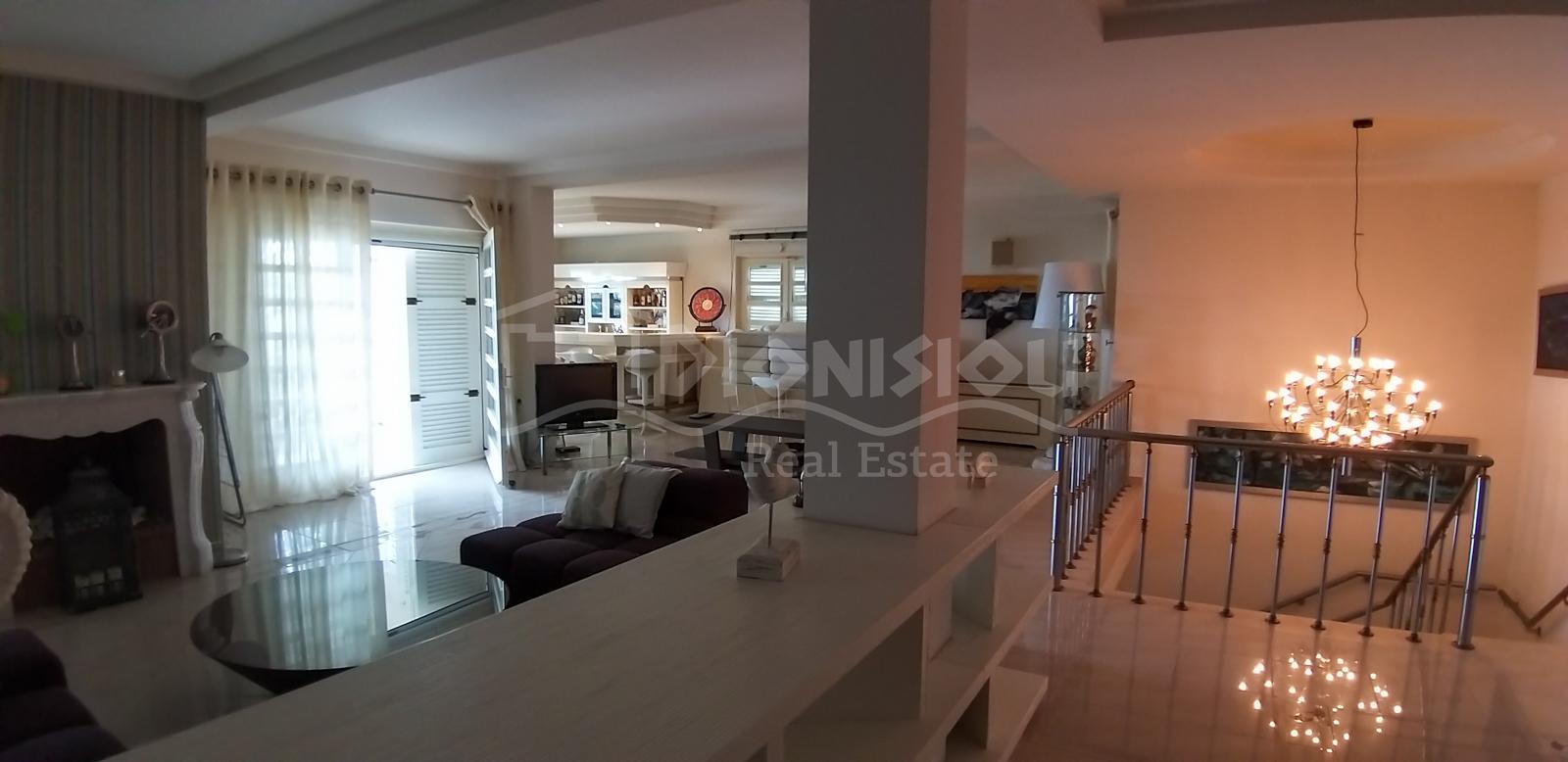 The ground floor consists of a large living room with a fireplace, a kitchen, wc, 2 bedrooms and a bathroom. The 1st floor consists of a huge living room with a fireplace, a bar, 5 bedrooms and 4 bathrooms. There are large balconies on the ground and 1st floors with a fantastic sea and Sithonia view.