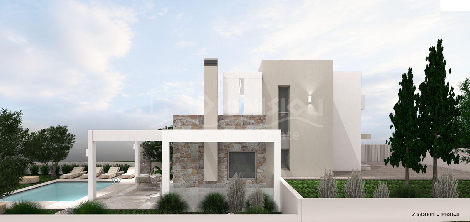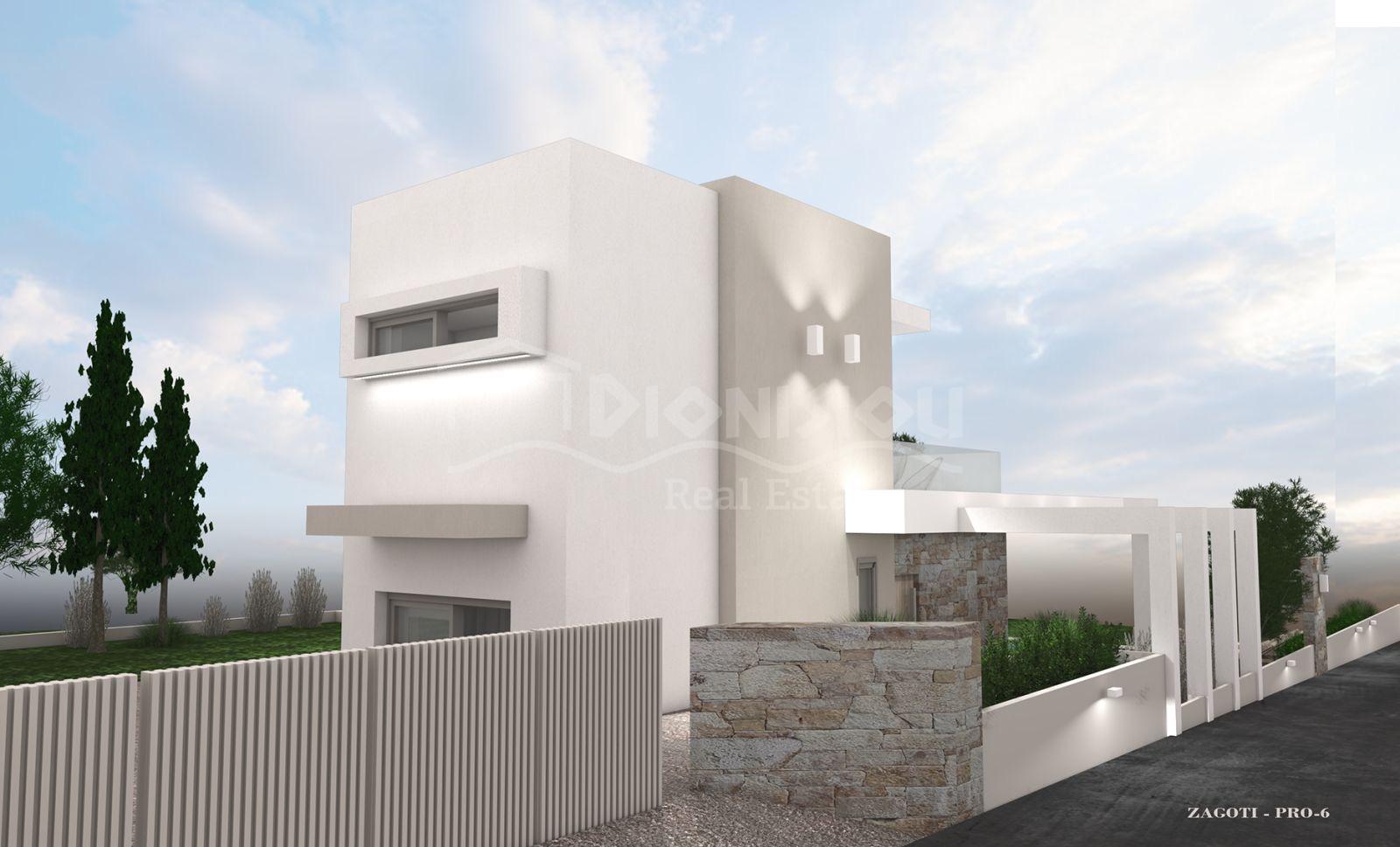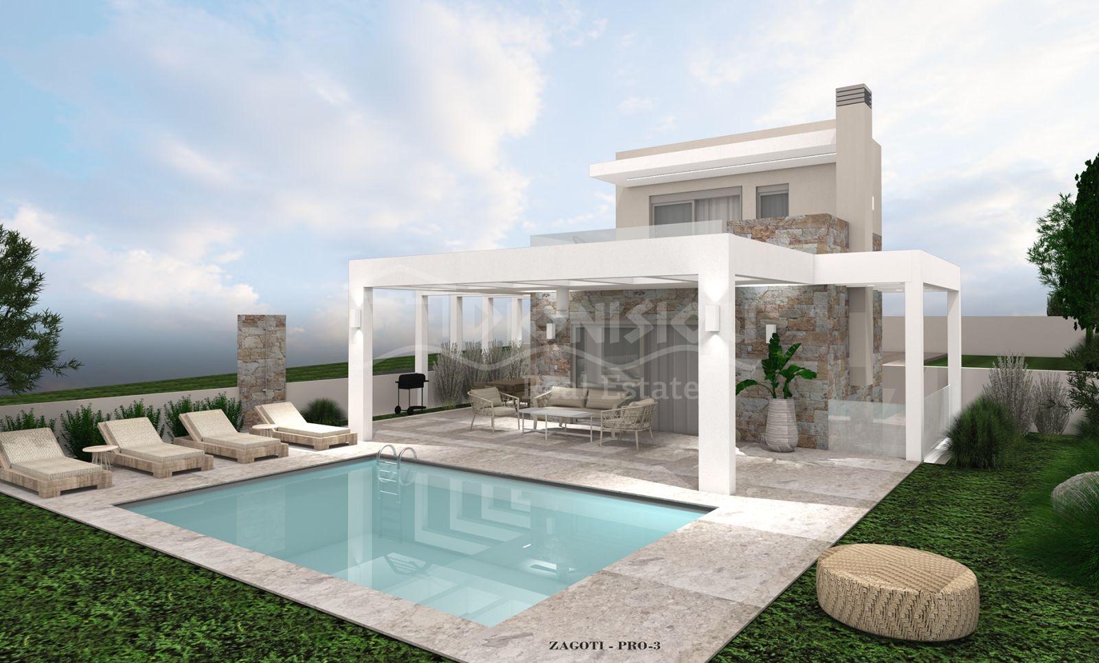 The modern villa is located in Dionisiou Paralia village 500 meters to the sandy beach.