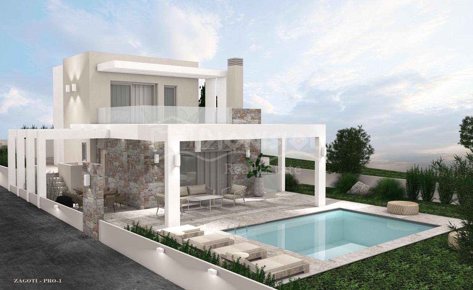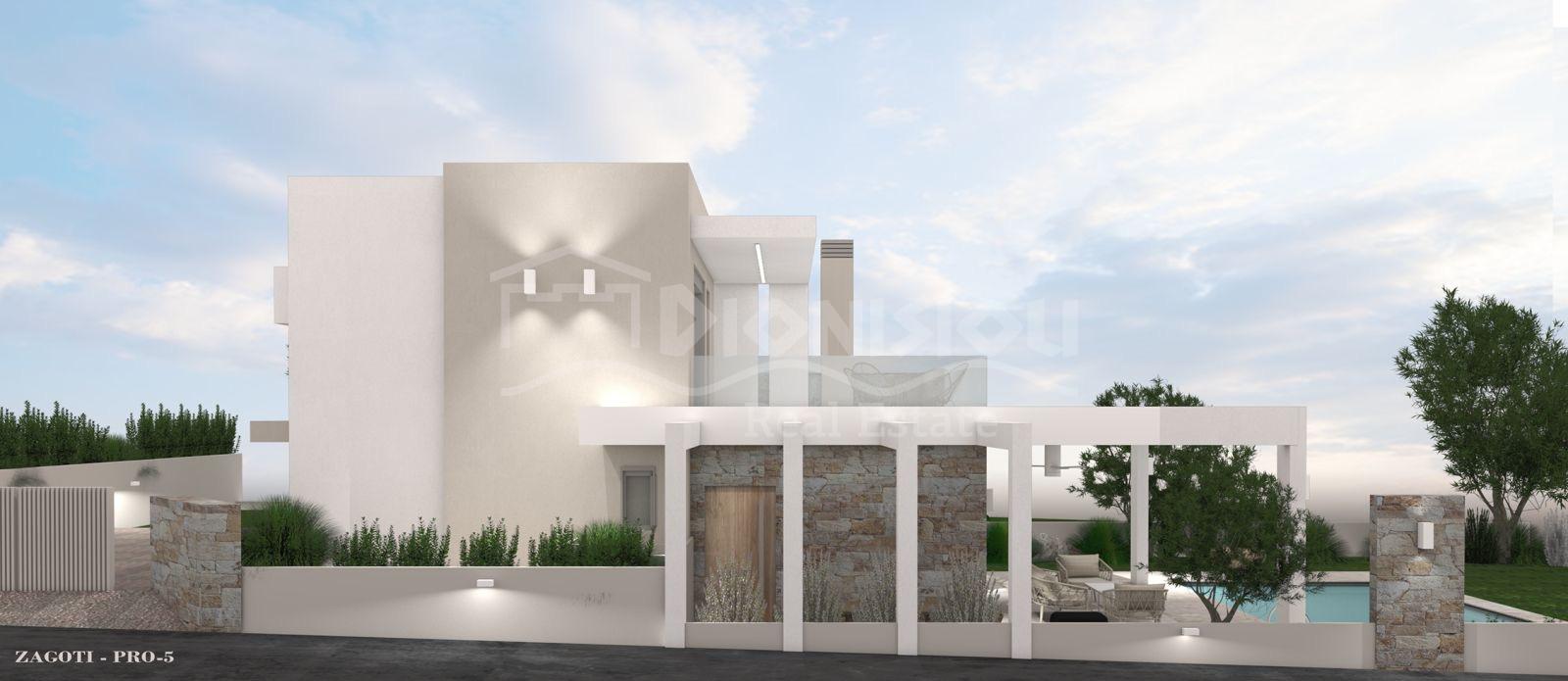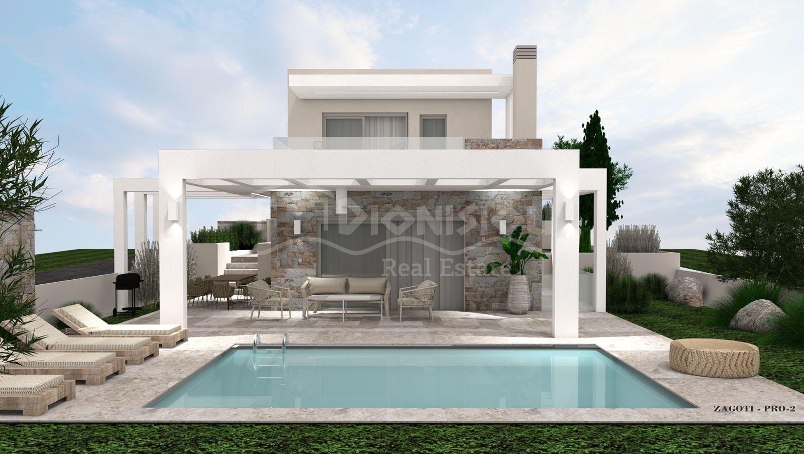 The modern villa is located in Dionisiou Paralia village 500 meters to the sandy beach.