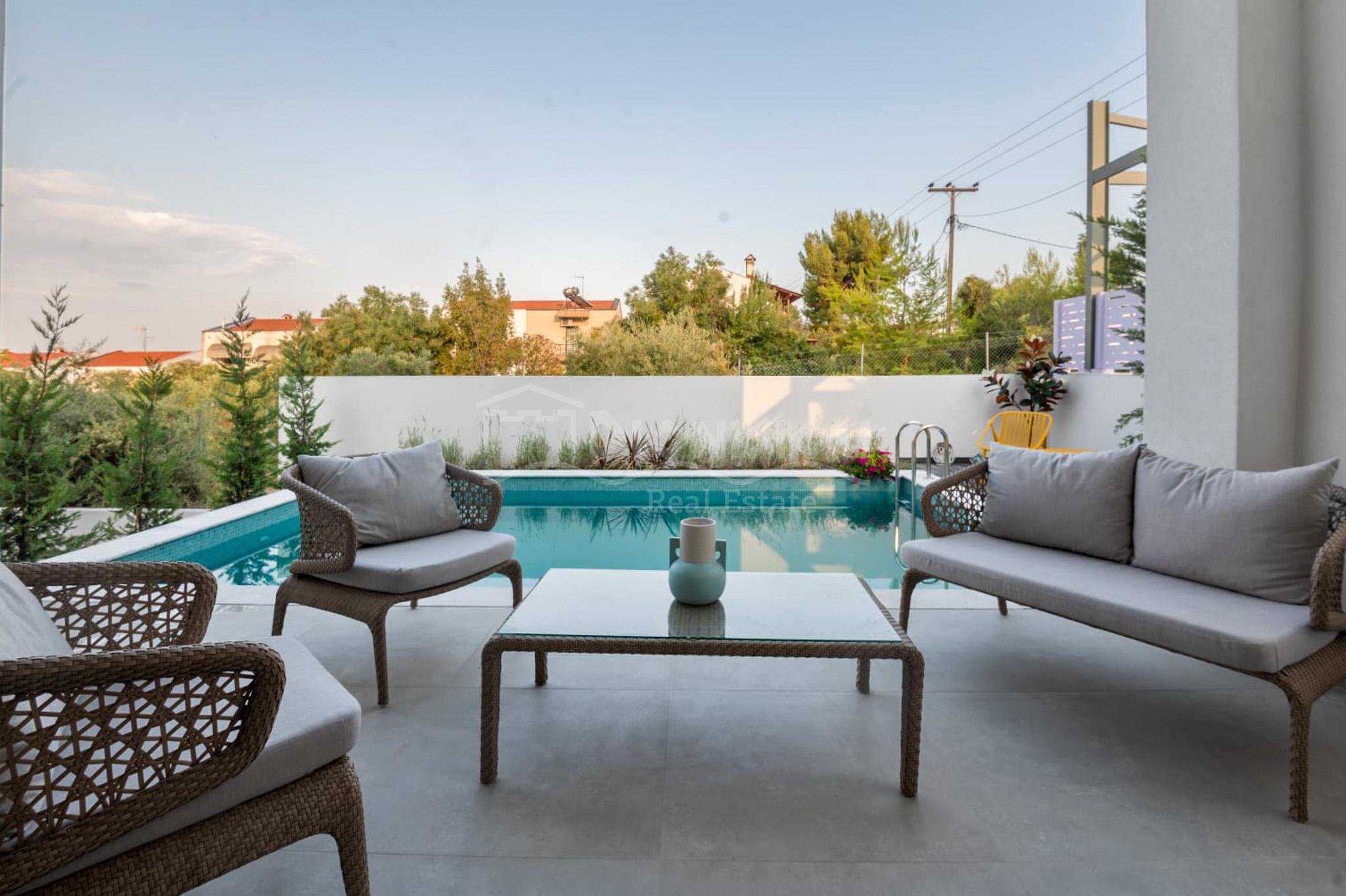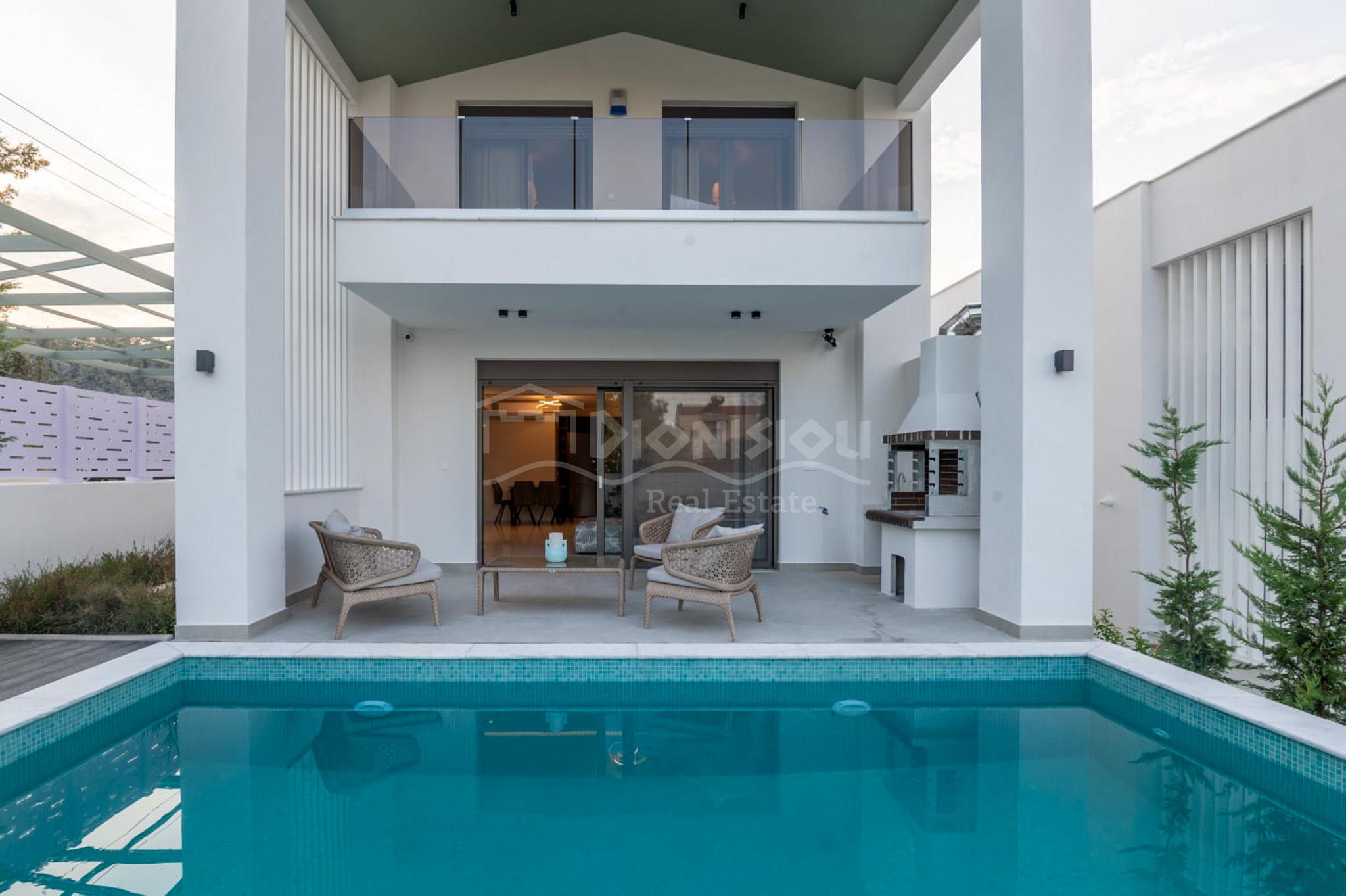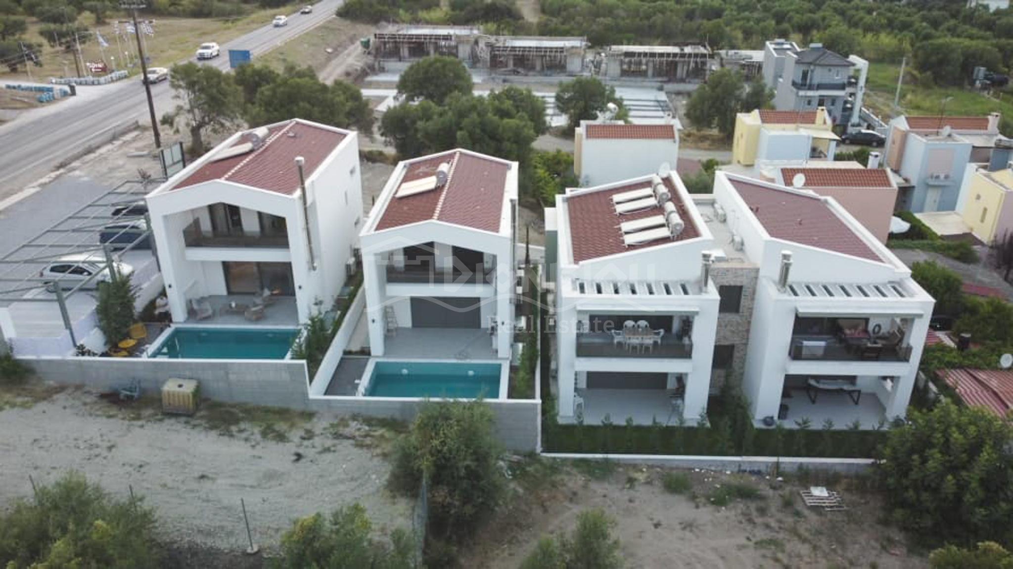 There are 4 villas in the complex and there is the last villa for sale. There is a swimming pool and barbeque in front of the villas.