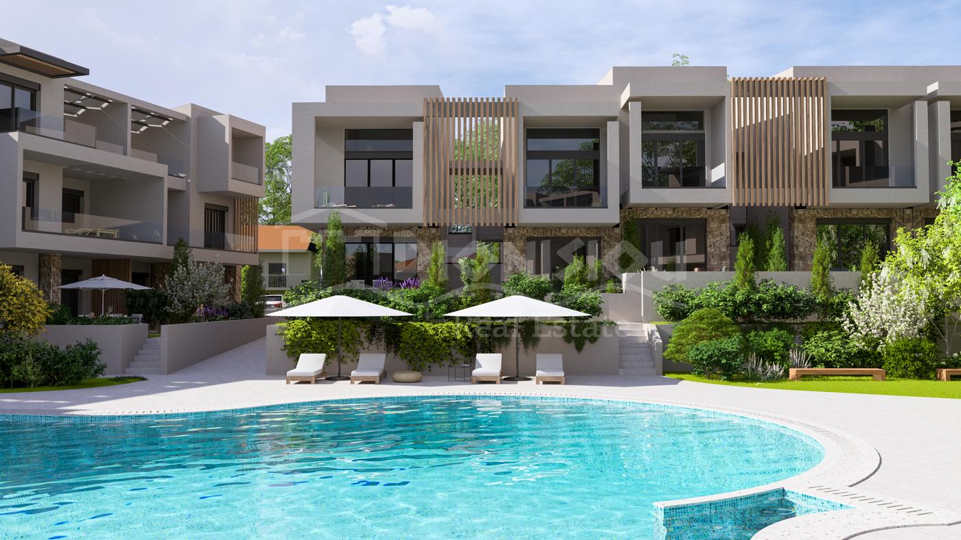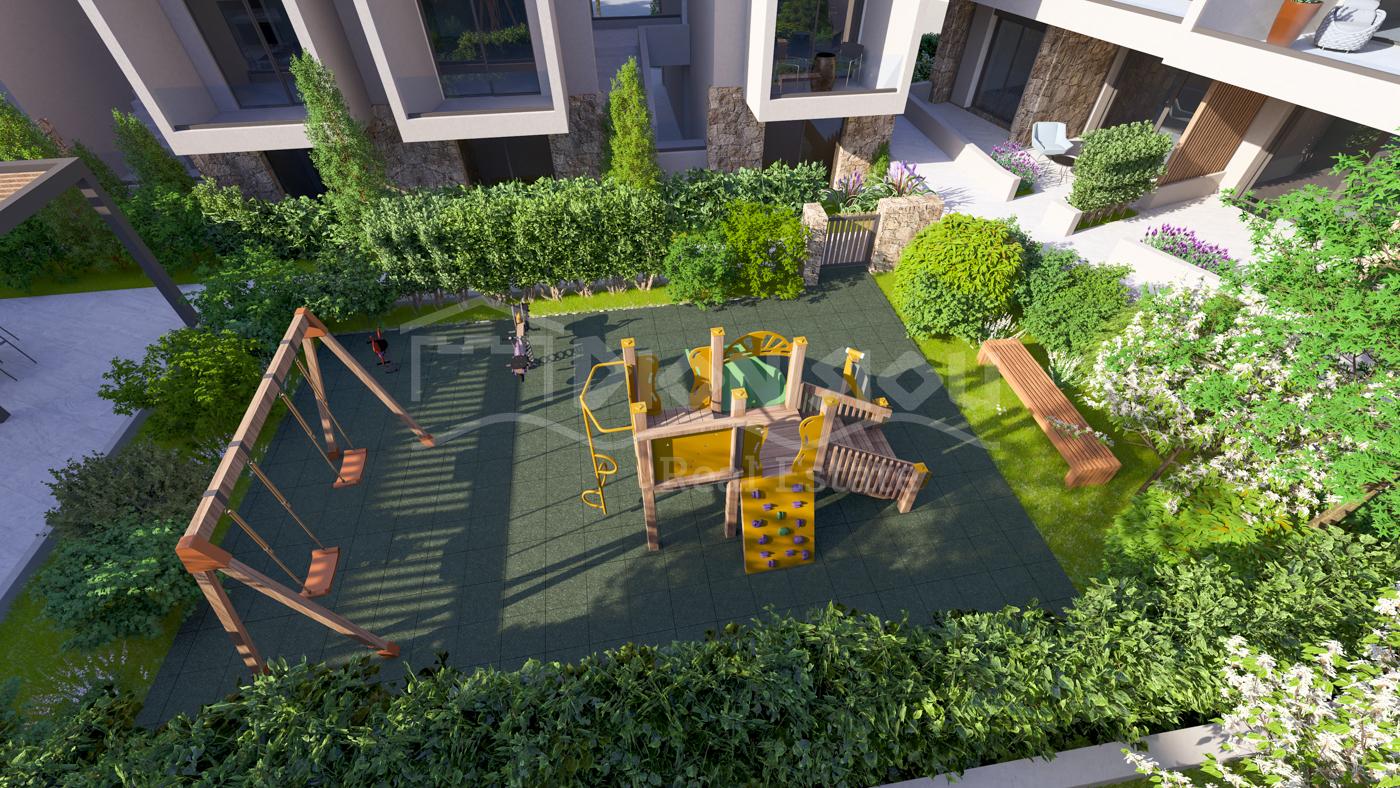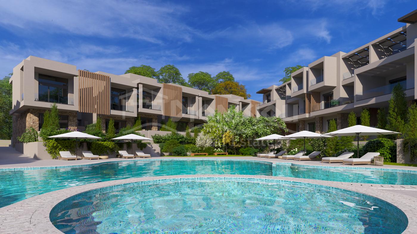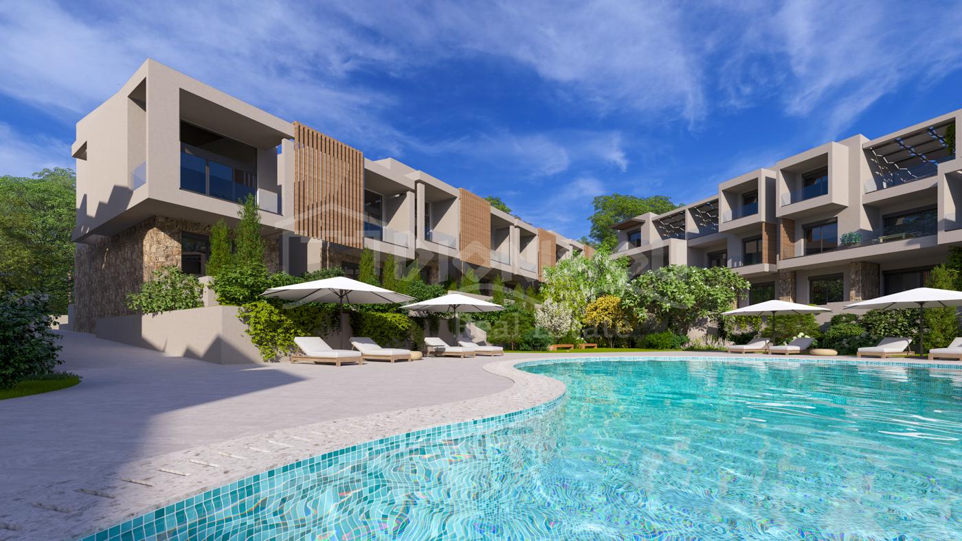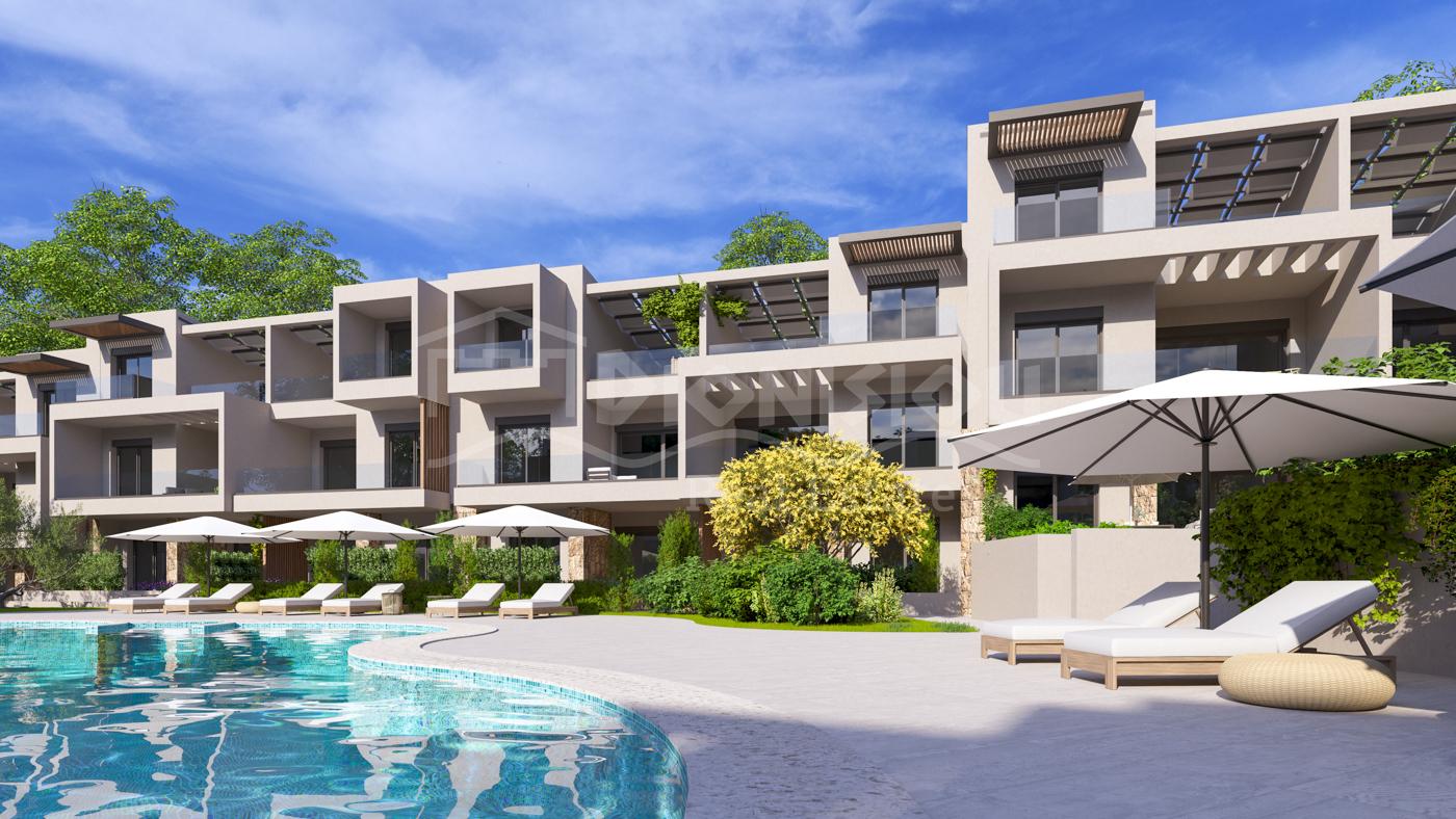 The apartments are located on the ground floor and are from 65 sq. meters with private gardens from 30 sq. meters witht he prices starting from 205 000 euro depending on its position in the complex. The apartments consist of a living room with a kitchen, 2 bedrooms, a bathroom and a veranda.