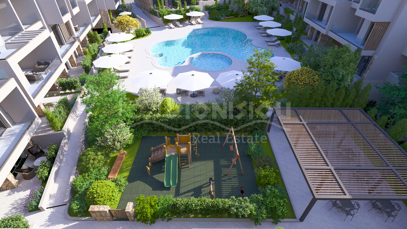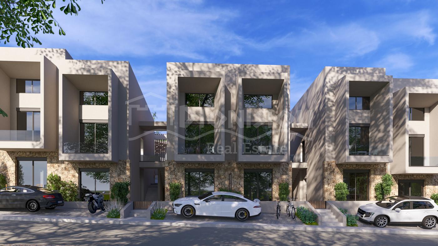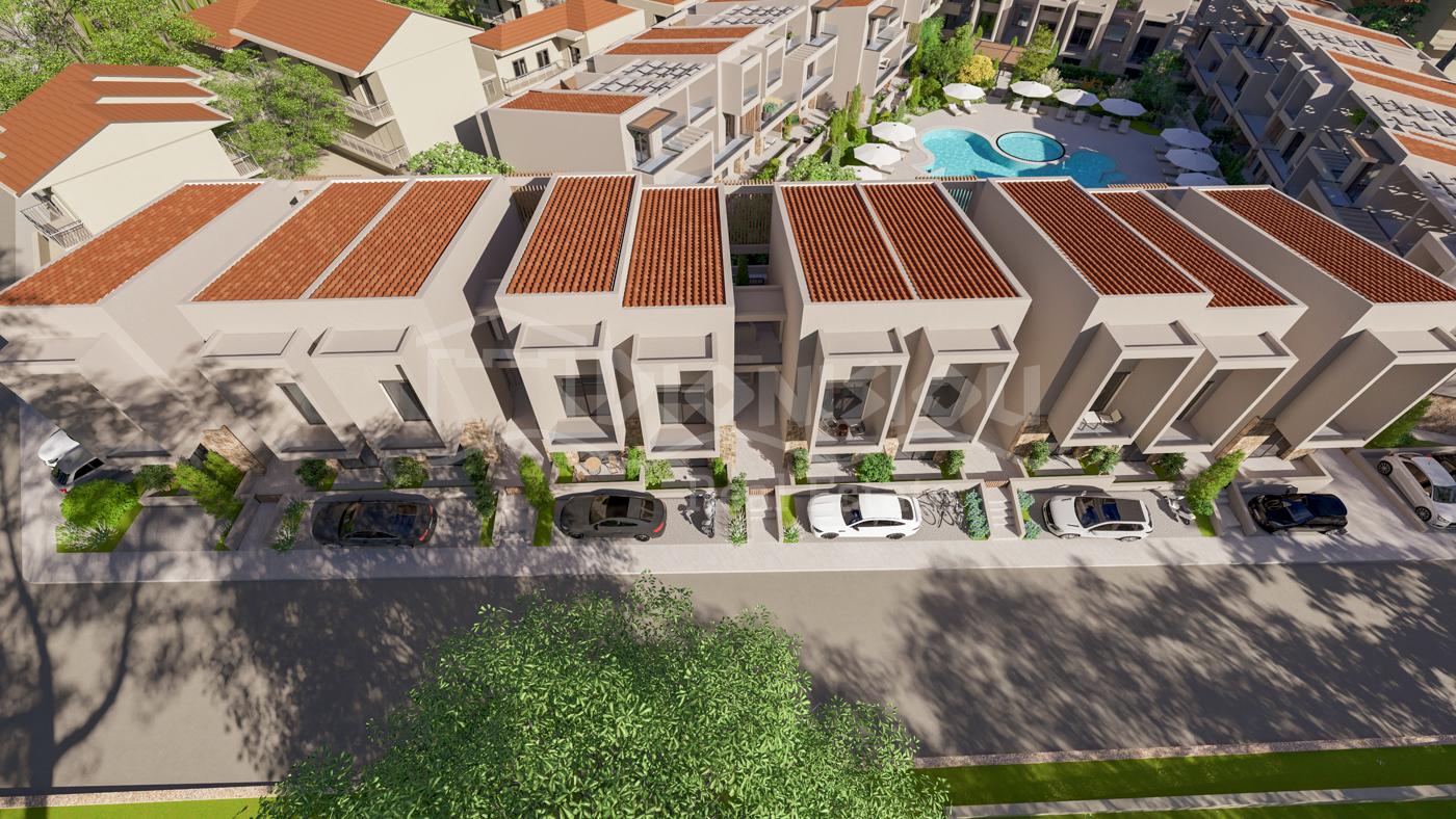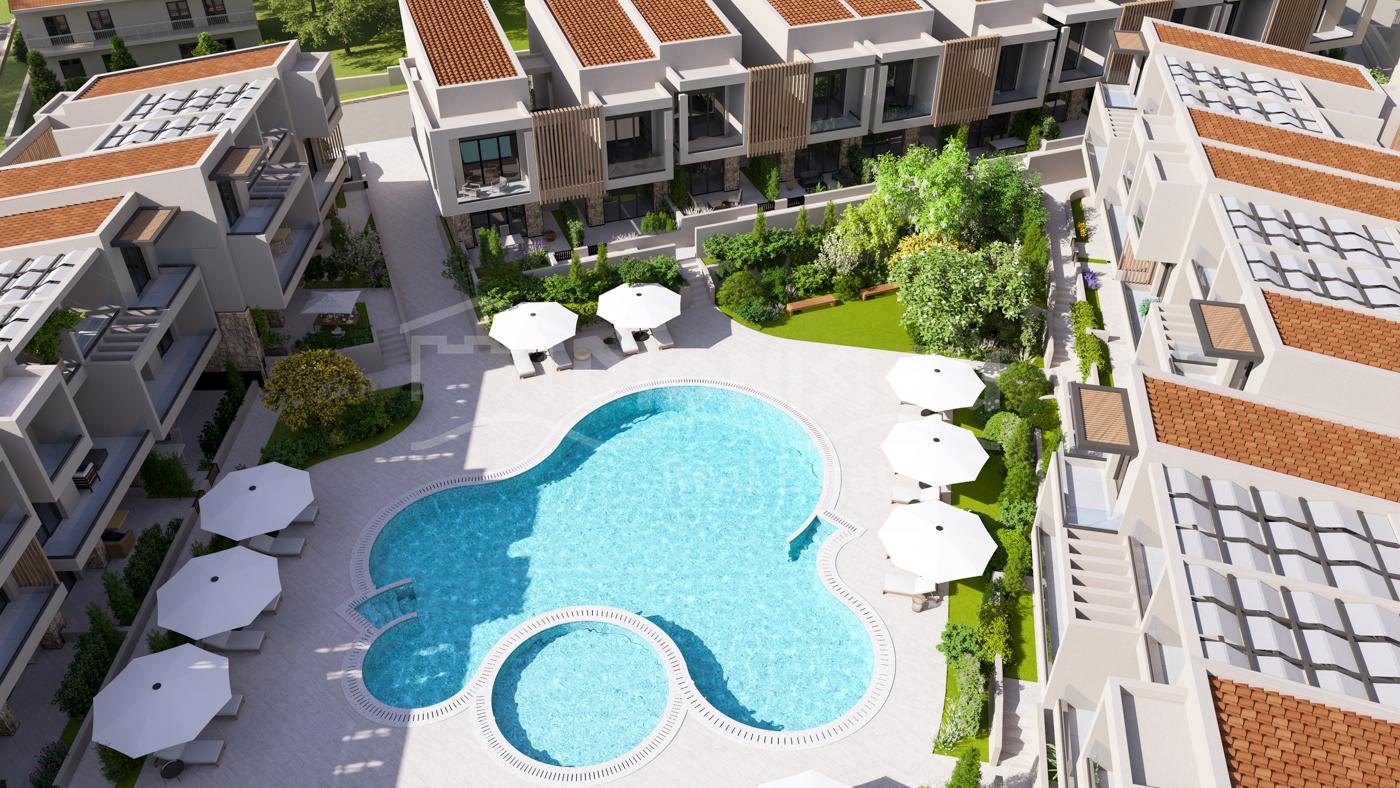The apartments are located on the ground floor and are from 65 sq. meters with private gardens from 30 sq. meters witht he prices starting from 205 000 euro depending on its position in the complex. The apartments consist of a living room with a kitchen, 2 bedrooms, a bathroom and a veranda.