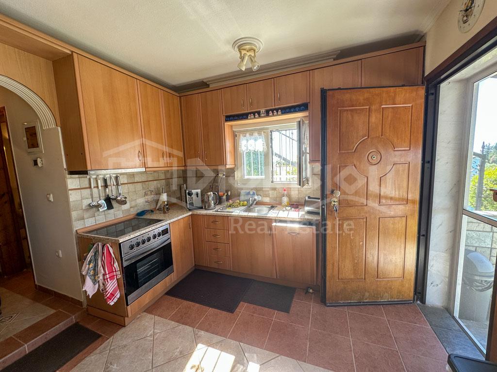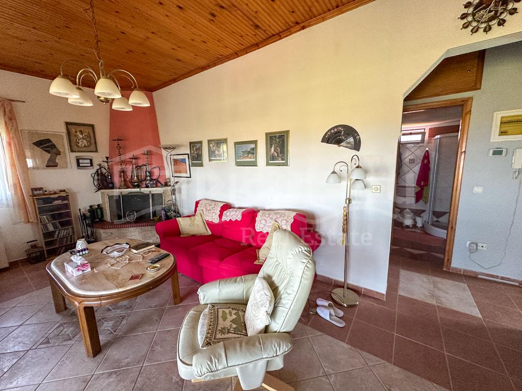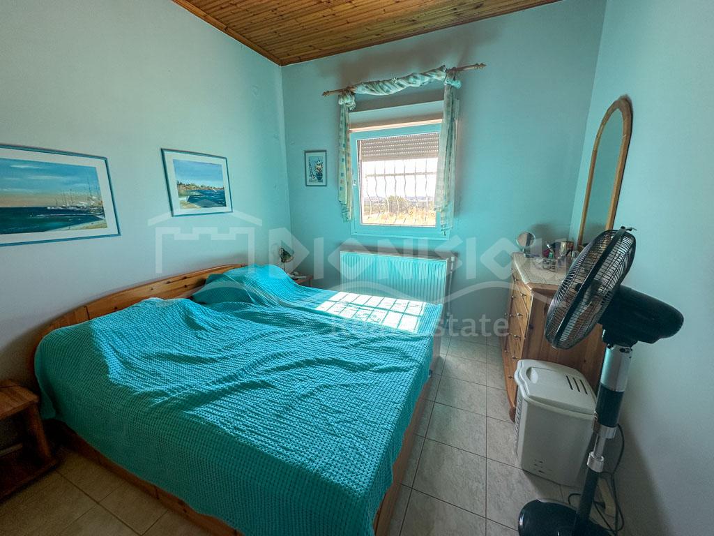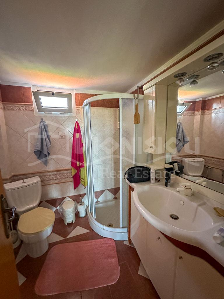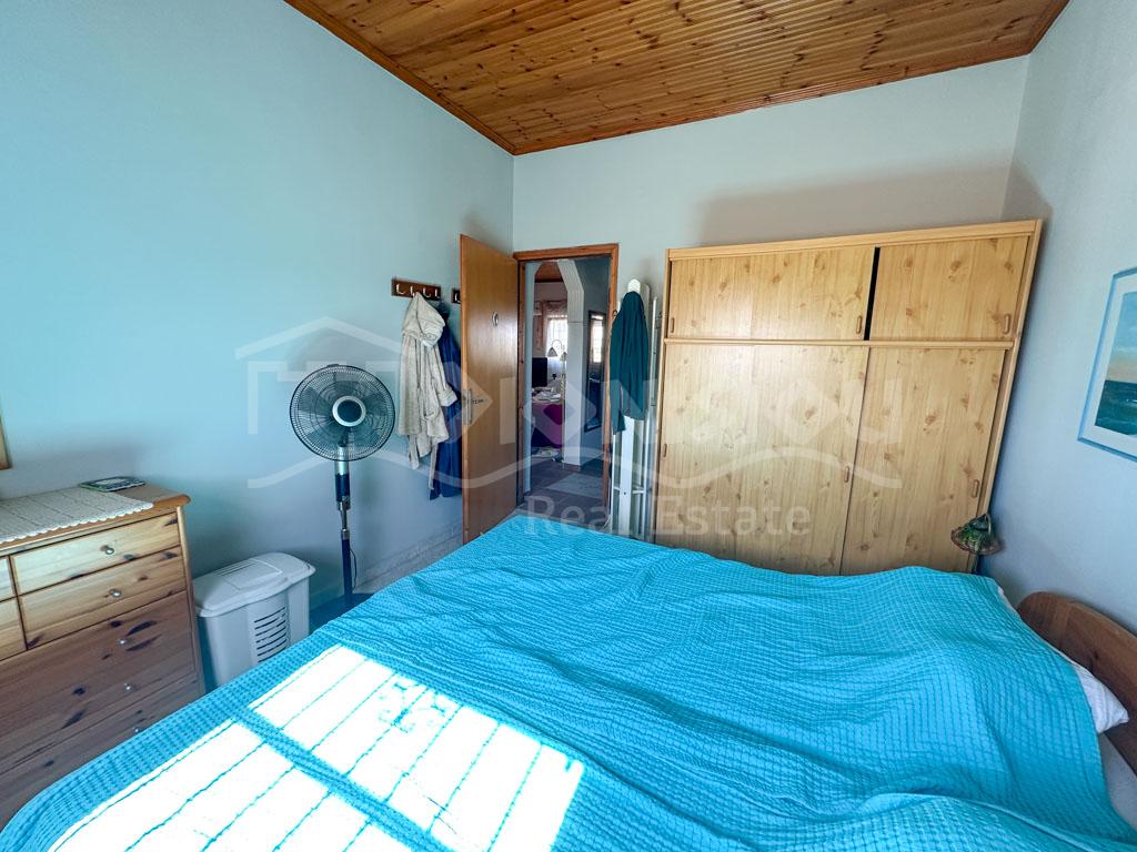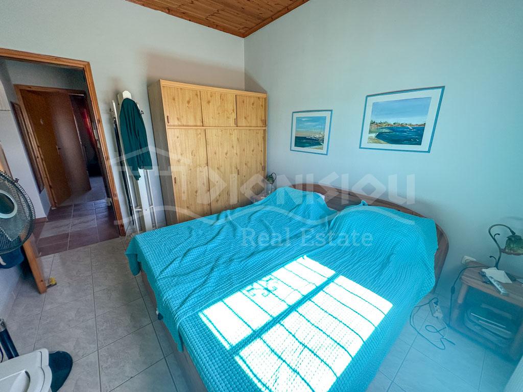 There are 2 floors in the house. The ground floor consists of a kitchen, a bedroom, a bathroom, a storage room and a veranda. The 1st floor consists of a living room with a fireplace, 2 bedrooms, a bathroom and a large corner balcony with fantastic sea view.