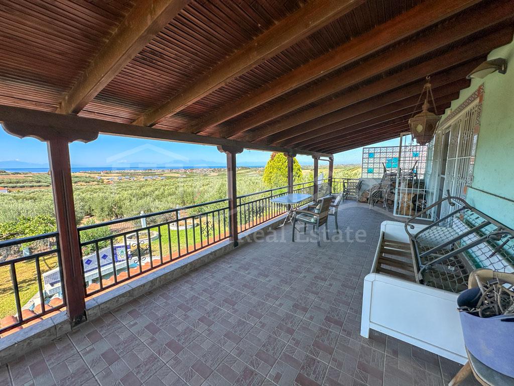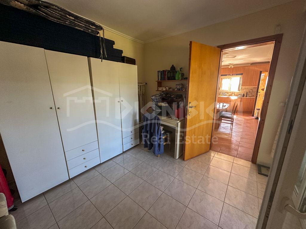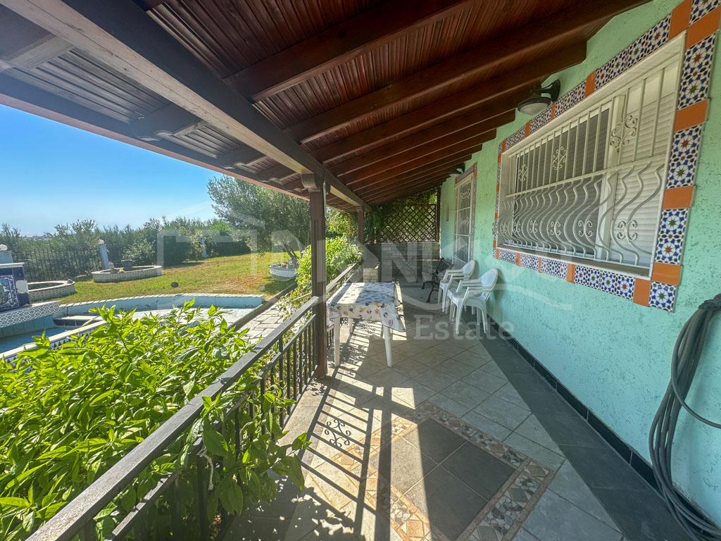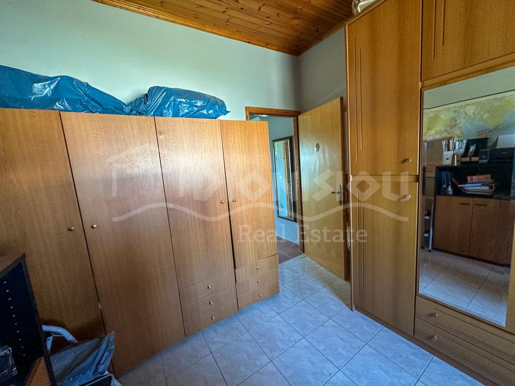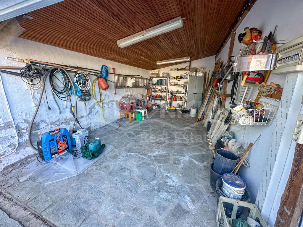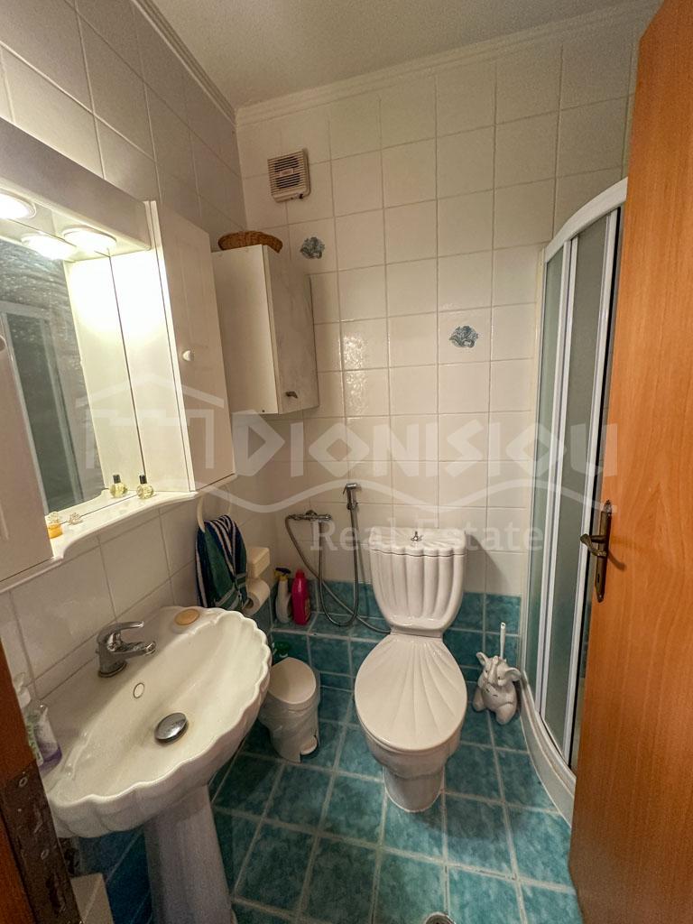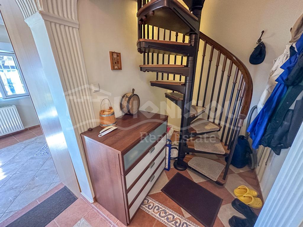 There are 2 floors in the house. The ground floor consists of a kitchen, a bedroom, a bathroom, a storage room and a veranda. The 1st floor consists of a living room with a fireplace, 2 bedrooms, a bathroom and a large corner balcony with fantastic sea view.