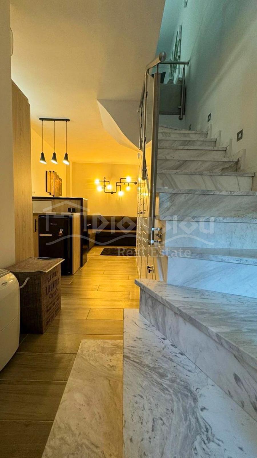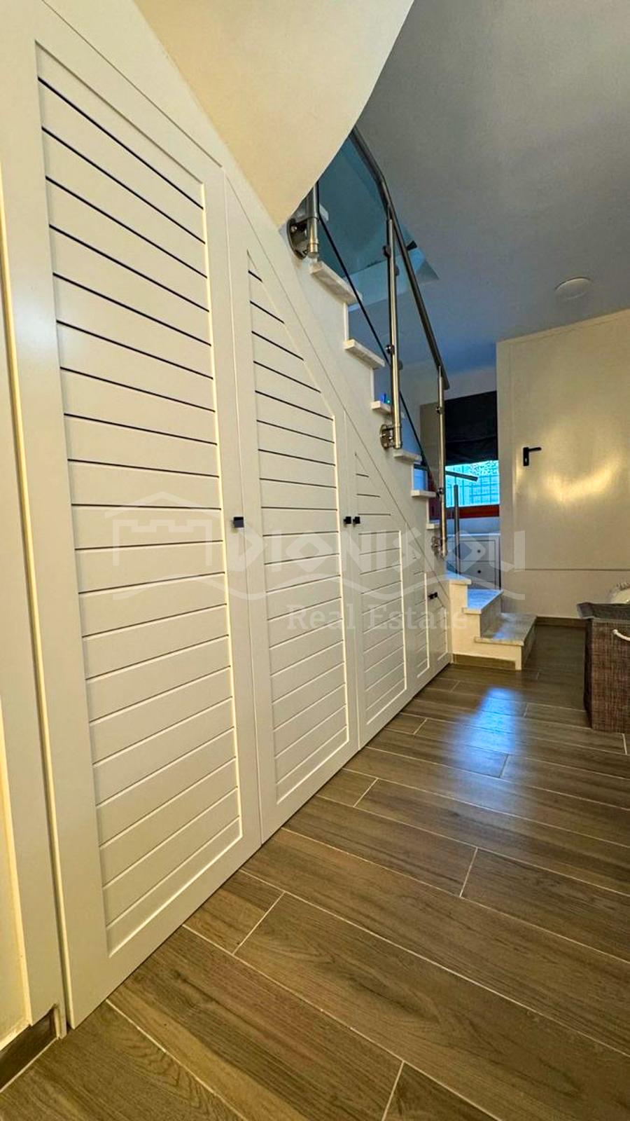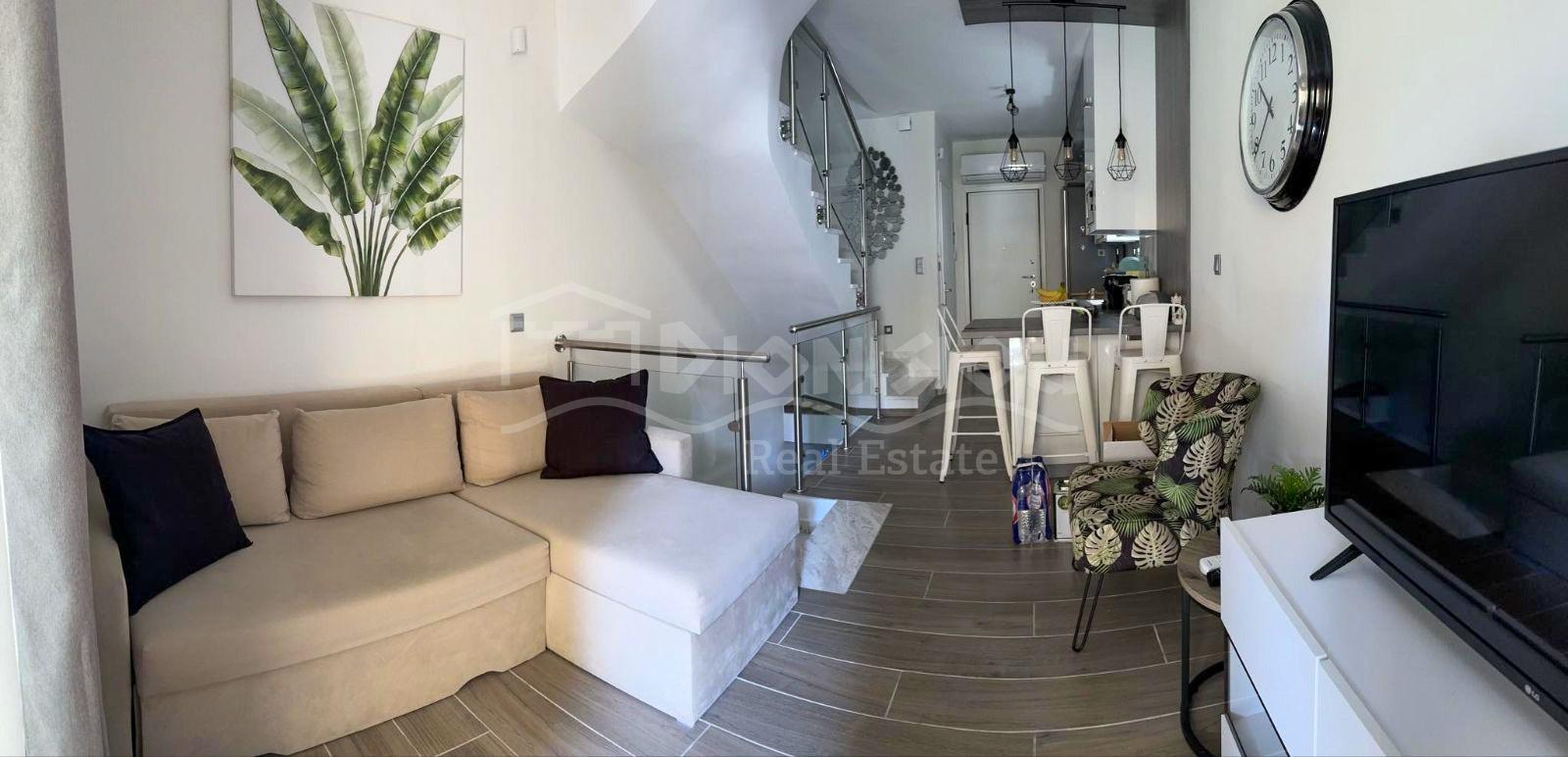There are 3 levels in the maisonetta. The half underground floor consists of a living room with a bar, a bathroom and a laundry room. The ground floor consists of living room with a kitchen, WC and veranda with BBQ. The 1st floor consists of 2 bedrooms, a bathroom and a balcony.