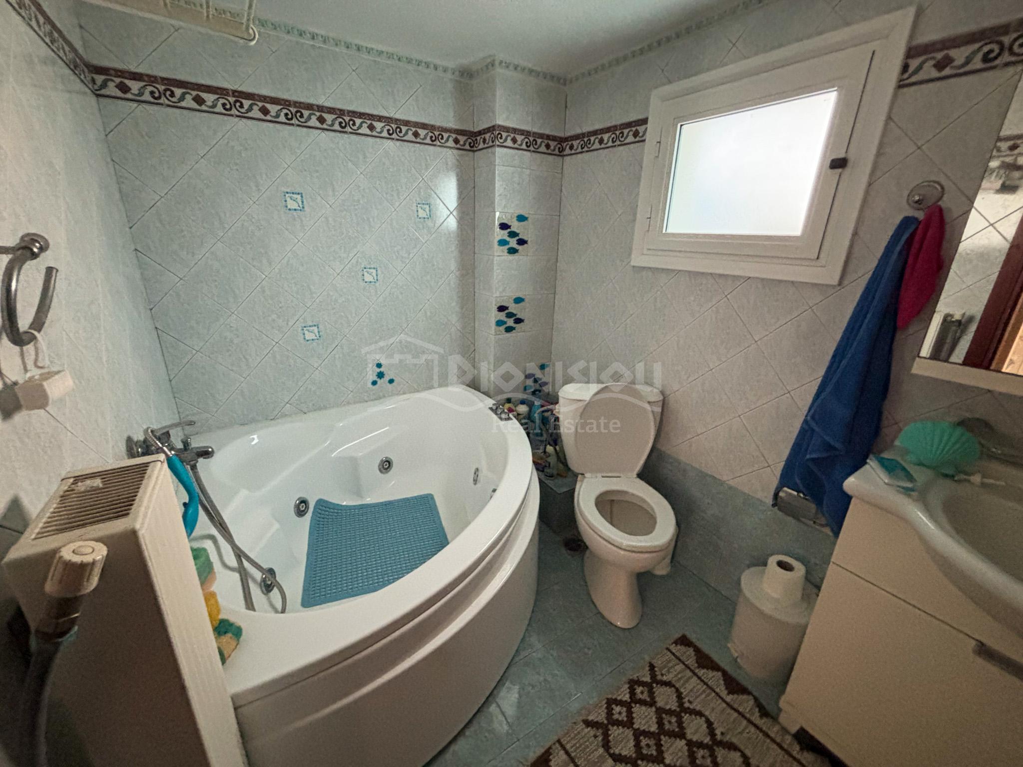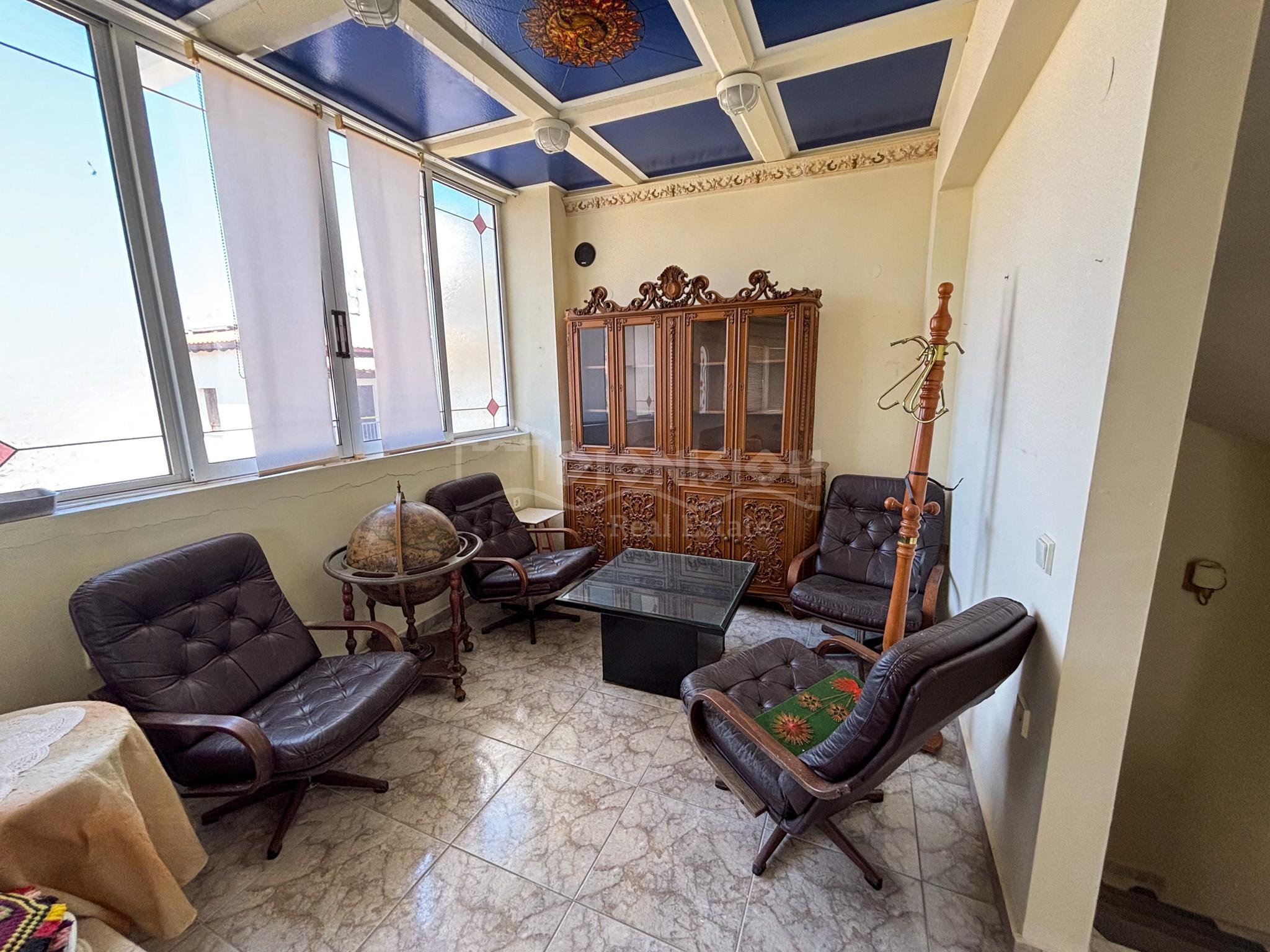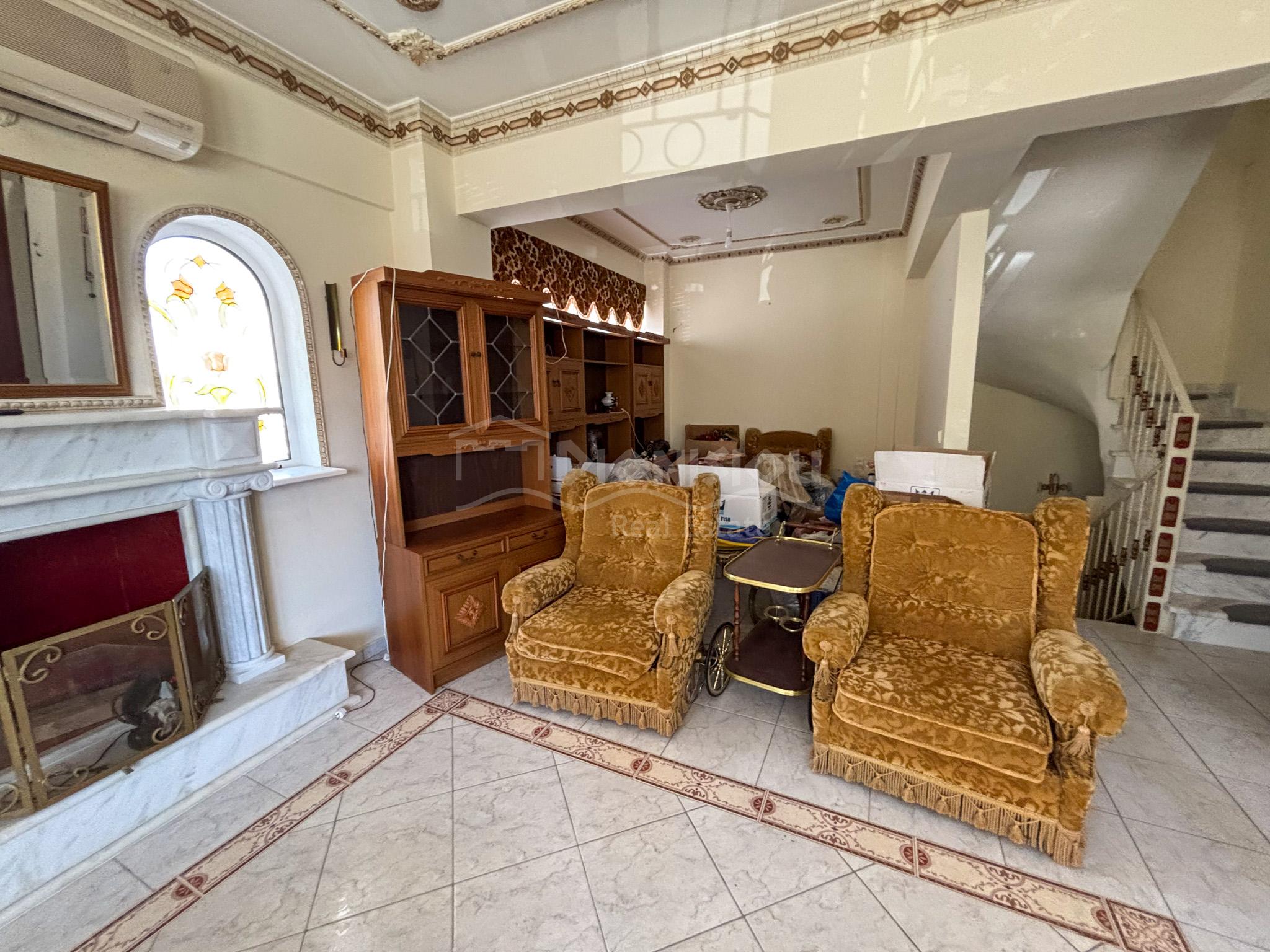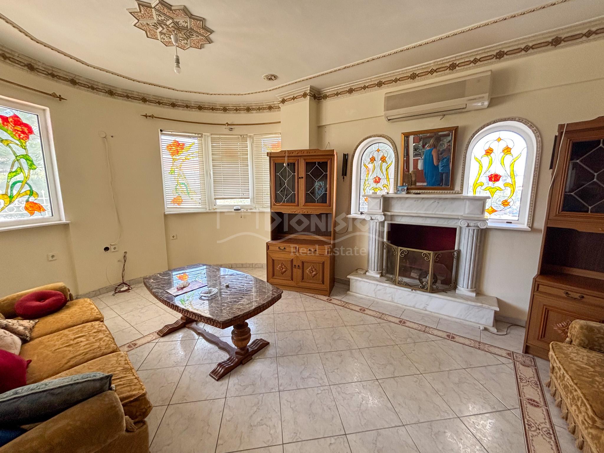 The high ground floor consists of a living room with a fireplace and a kitchen, a bathroom with a jakuzzi, a closed balcony which can be used for a summer restaurant area and a balcony.